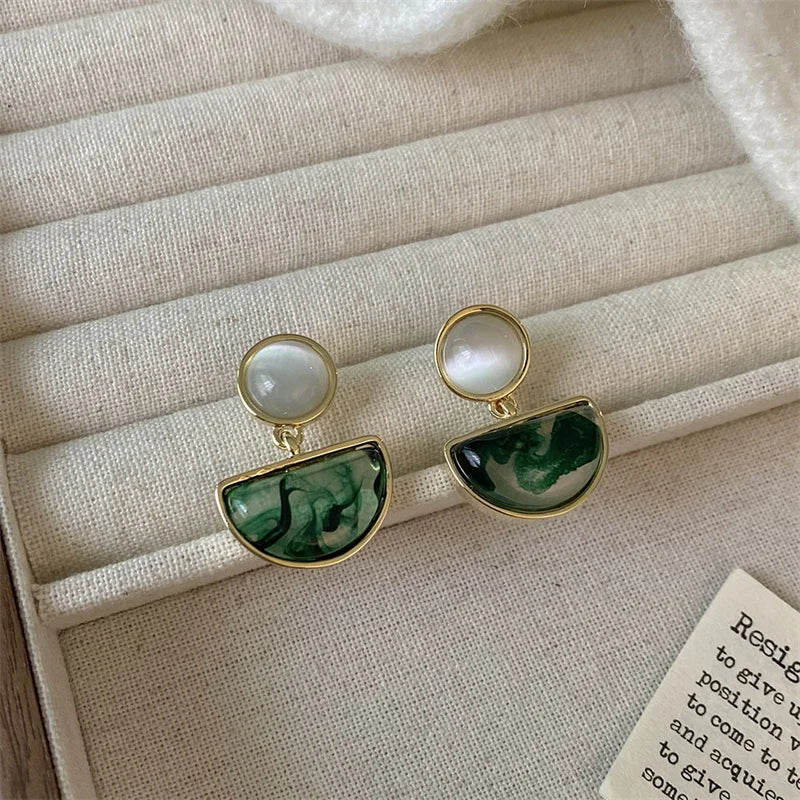 - Design em meia-lua com contraste entre pérola e tom esverdeado