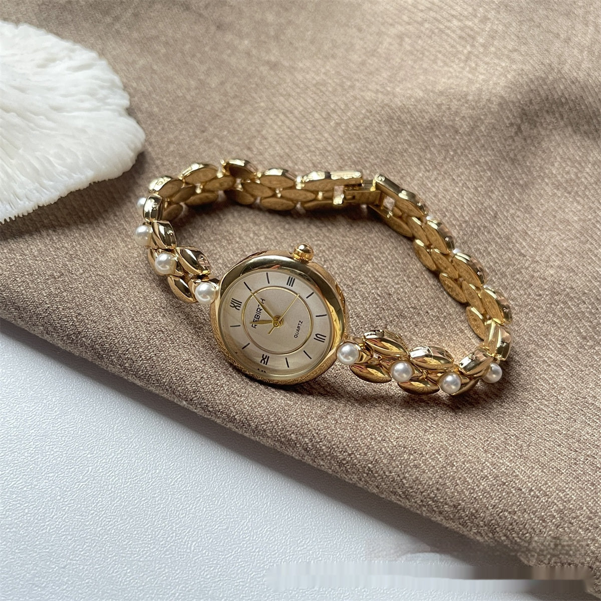 Damenarmbanduhr mit Metallarmband und Perlen
