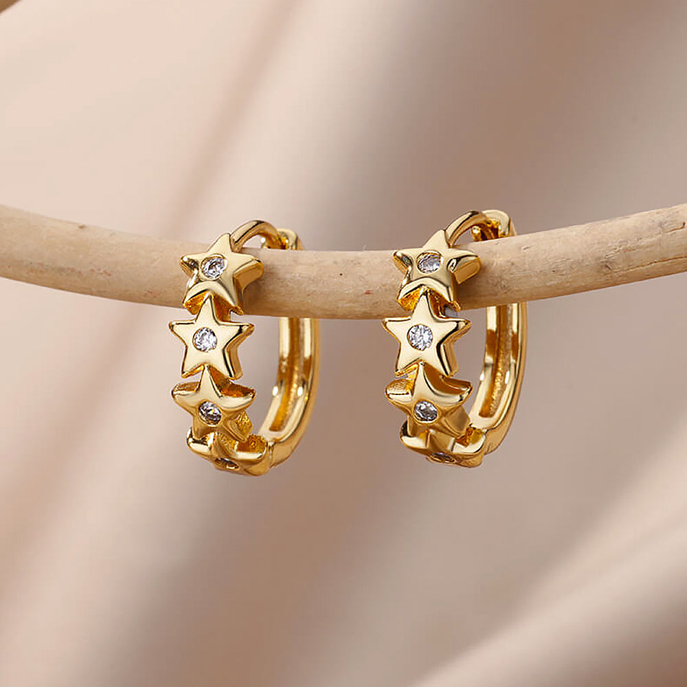 Os brincos com Estrelas Pendentes Eleonora encantam com o seu design celestial e brilho delicado. As pequenas estrelas douradas cravejadas com cristais reluzentes formam um padrão harmonioso e sofisticado, refletindo a luz com cada movimento. A combinação entre elegância e leveza torna esta peça ideal para quem deseja adicionar um toque de brilho e feminilidade ao visual, sem perder a delicadeza.