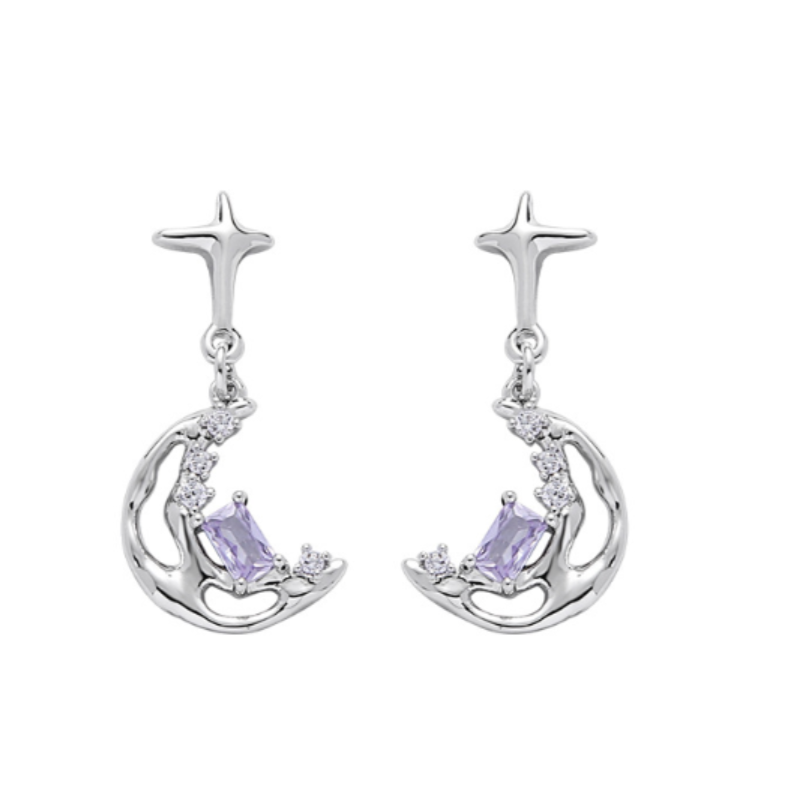 Os brincos com Pingentes Giorgia são uma verdadeira homenagem ao charme celestial. Inspirados na beleza do céu noturno, apresentam um delicado design em formato de lua adornada com cristais reluzentes e uma pedra central lilás de corte geométrico. A combinação de formas suaves e brilho intenso cria um visual romântico e elegante, perfeito para destacar o rosto com sofisticação e encanto.